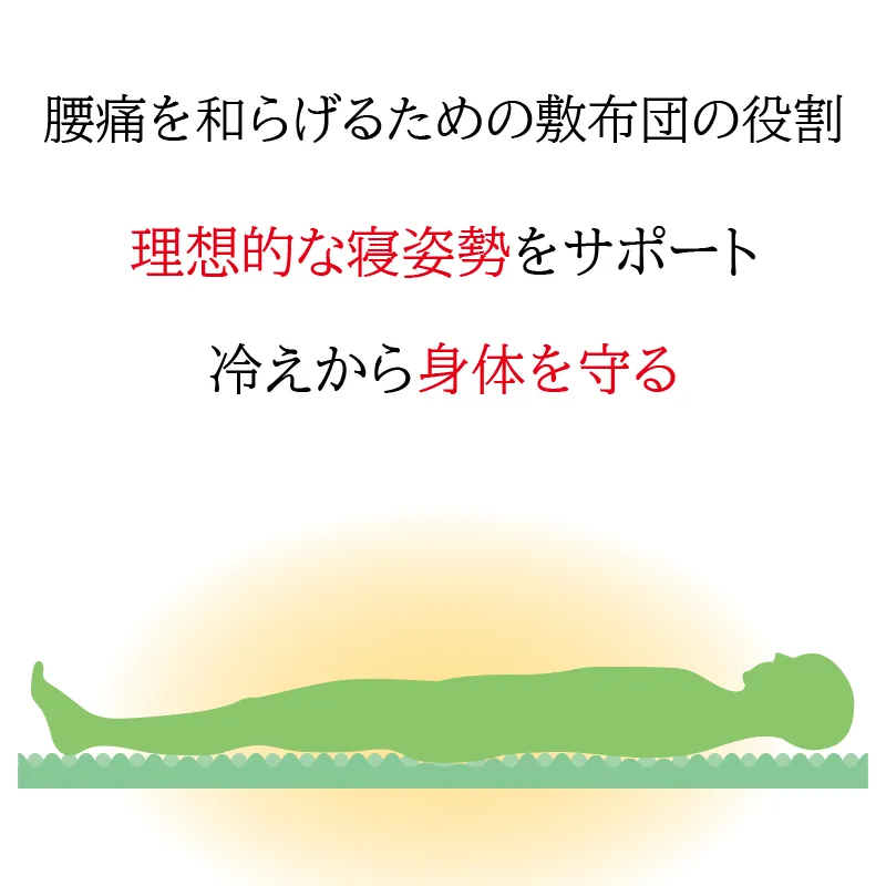 「寝姿勢(寝ている時の姿勢)」をサポートし、「冷え」から身体を守ることが、腰痛を和らげるための敷布団の役割なのです。