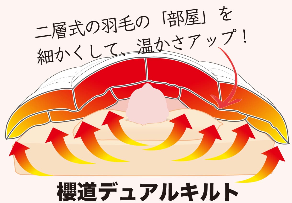 • ダウンが1.5kgとたっぷり入っていて温かい!さらに当店オリジナルの「櫻道デュアルキルト」で保温性UP!
