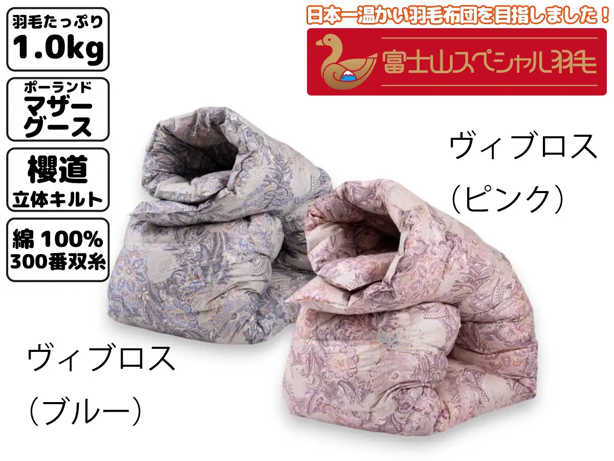 【アウトレット514/限定1枚】富士山スペシャル羽毛 合掛け【8合目】シングル150cm×210cm ヴィブロス(ピンク) (中身:ポーランドマザーグース(ハンドセレクト) ダウン95% フェザー5% / 充填量:1.0kg / 側生地:綿100%(300番手双糸) / 縫製:櫻道立体キルト) (《B品》カタログ撮影品 処分のため販売価格430000円⇒248000円 )