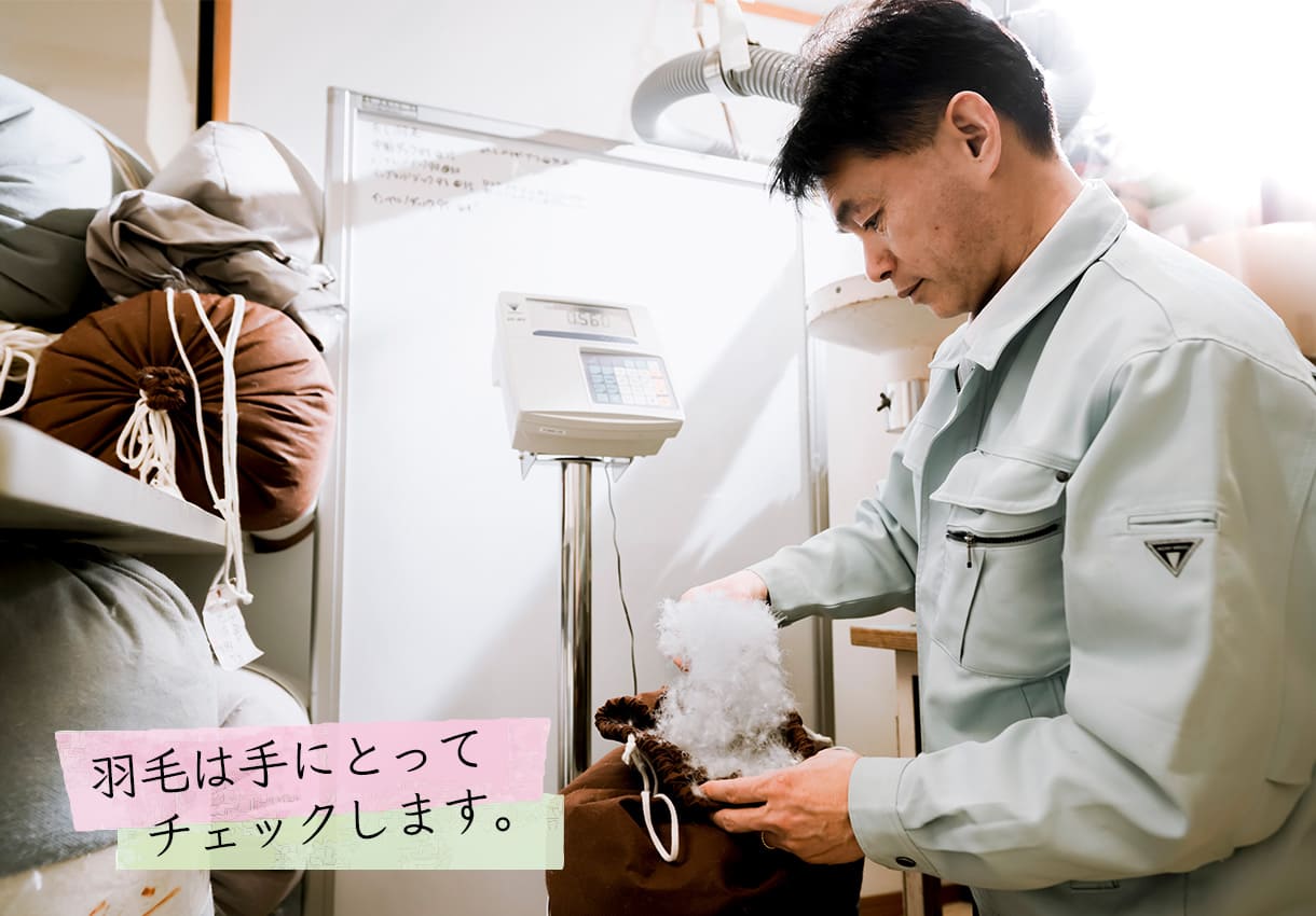 長年の経験から、羽毛に触り確認することは安心の羽毛をお届けする上で、重要なことと考えています。