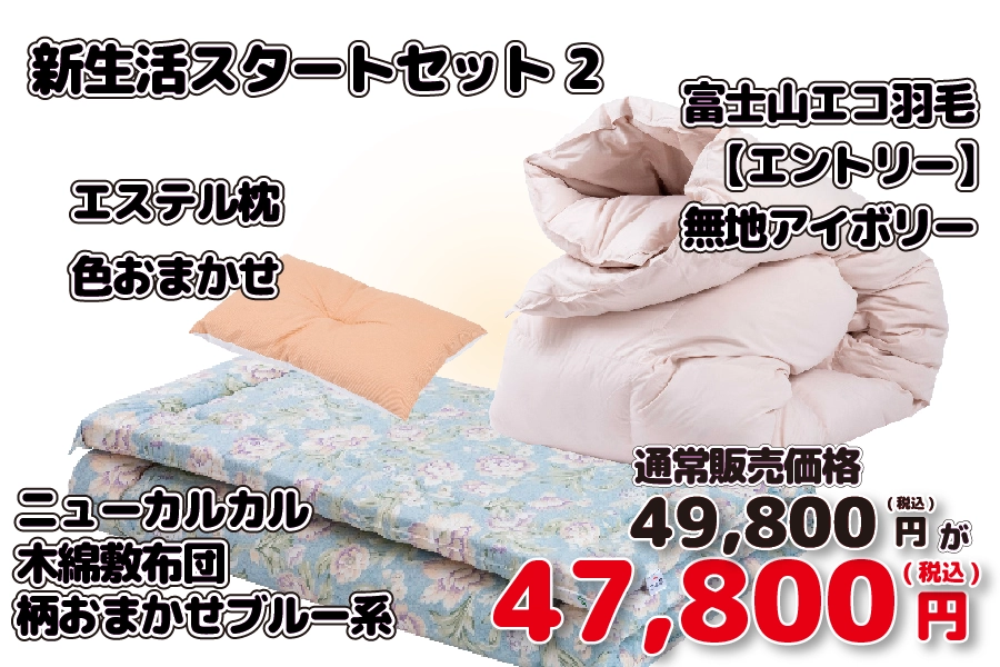 【新生活002/限定5枚】新生活スタートセット2(エコ羽毛エントリー・ニューカルカル木綿・エステル枕(43×63))シングル(丈210) 柄おまかせブルー系 (セール限定販売価格49800円相当⇒47800円 )