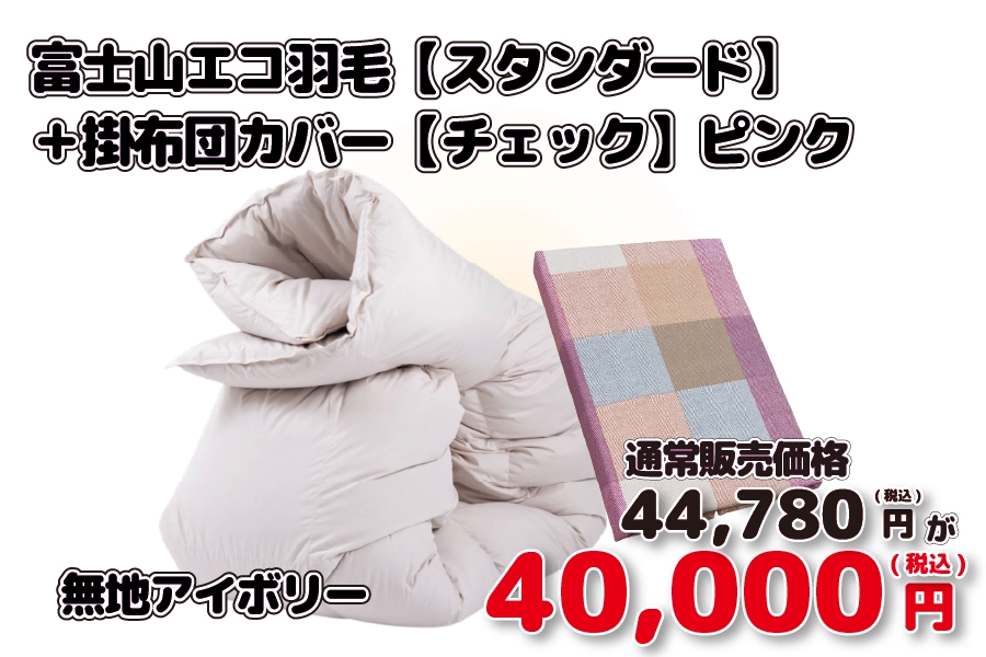 【新生活020/限定5枚】富士山エコ羽毛【スタンダード】(充填量1.3kg)シングル150cm×210cm 無地アイボリー + 掛布団カバー【チェック】ピンク (セール限定販売価格44780円相当⇒40000円 )
