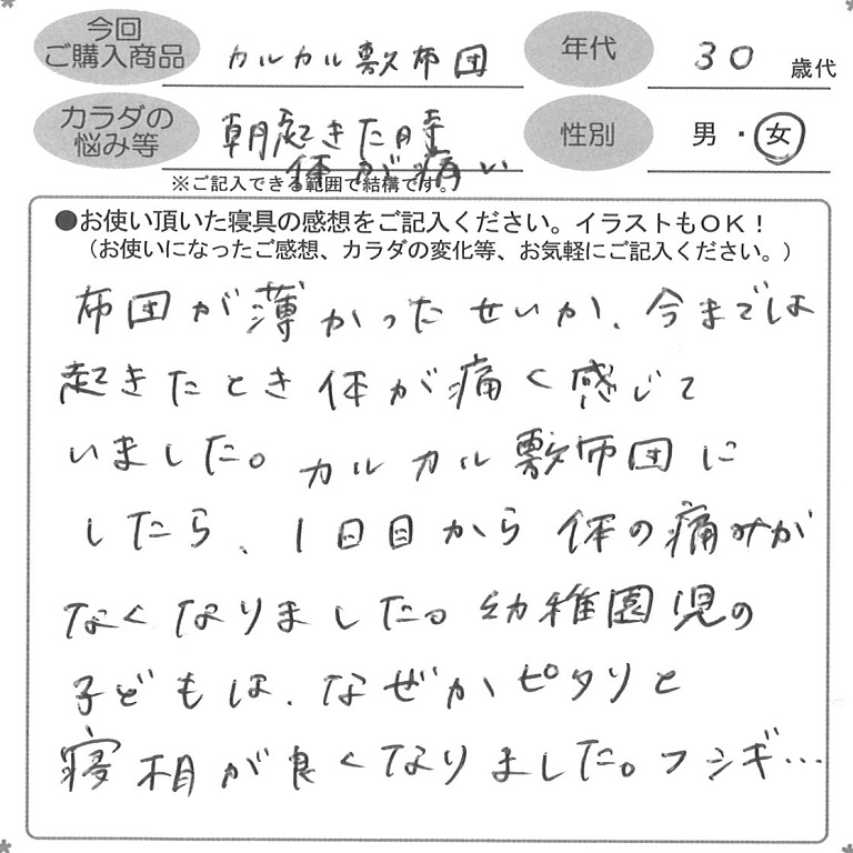 カルカル敷布団にしたら、1日目から体の痛みがなくなりました。
