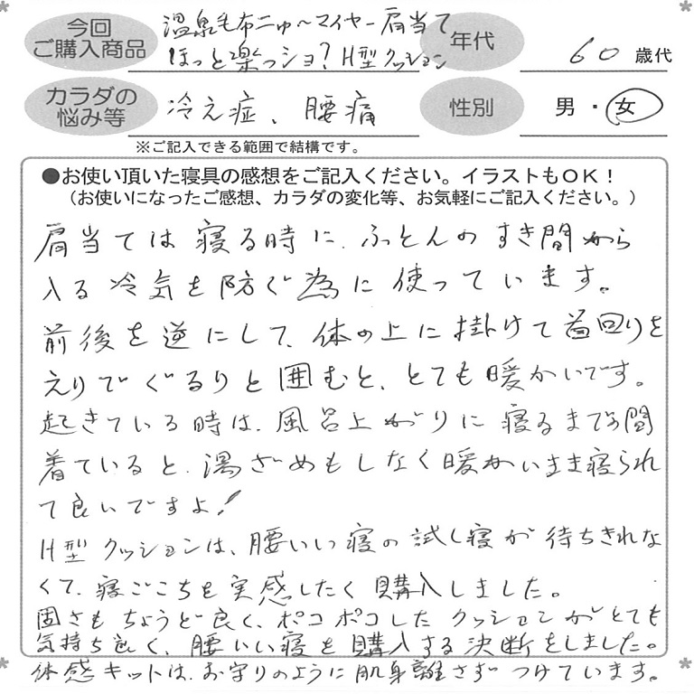 長年腰痛で悩んでいました。使い始めて直ぐにとても暖かくよく眠れていると感じ、腰痛も改善されていきました。 (大阪府 50代 女性)