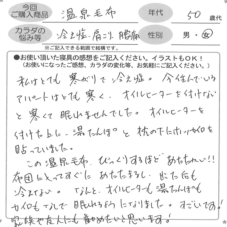 オイルヒータを付けた上に、湯たんぽと枕の下にホッカイロを貼っていました。